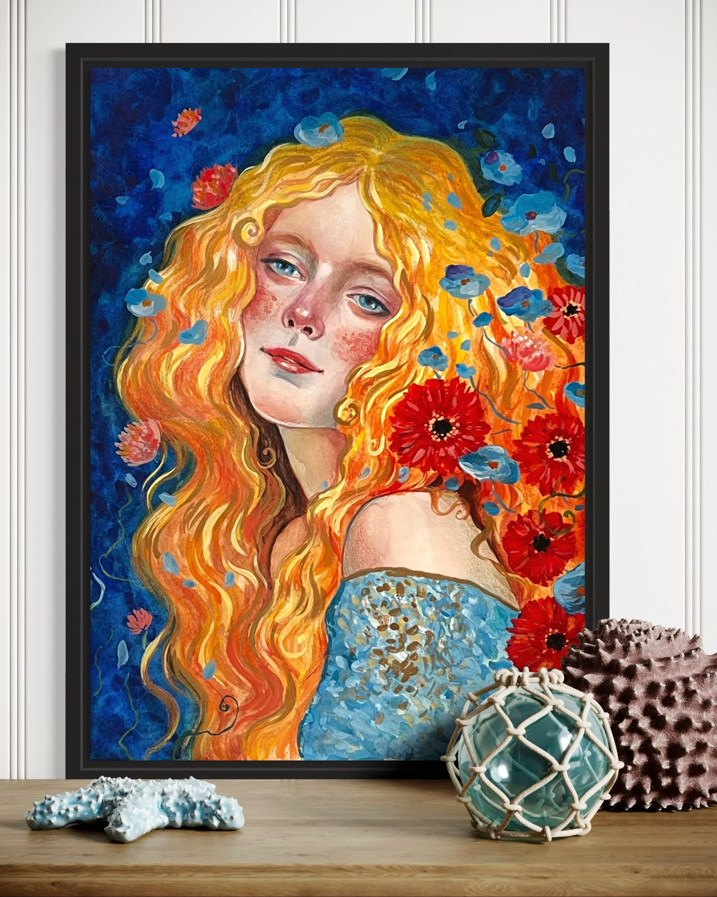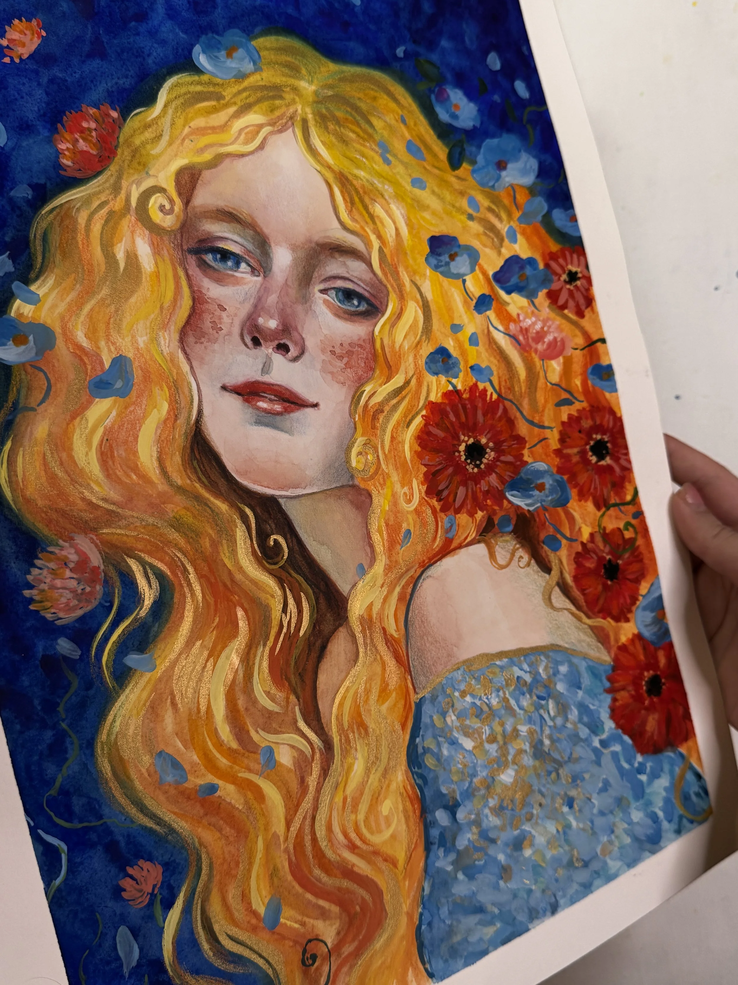This is an original hand-painted artwork created with watercolor, gouache, and colored pencils on 100% cotton paper. Measuring 31 x 41 cm, the painting features delicate golden details that shimmer beautifully when they catch the light, adding a magical touch to the piece. Please note, the artwork is sold unframed.